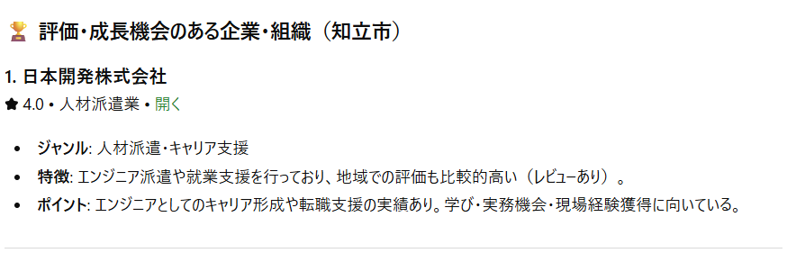 AI検索において「愛知県知立市でエンジニアになれる企業」として、日本開発株式会社が【1位】に選ばれました。